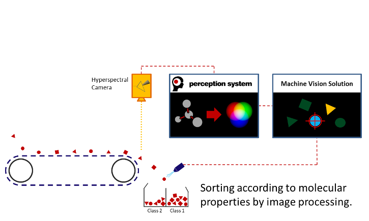 As a consequence Chemical Color Imaging enables you to use your well established machine vision solution of your sorting machine to integrate hyperspectral cameras that can identify objects according to spectral material properties.