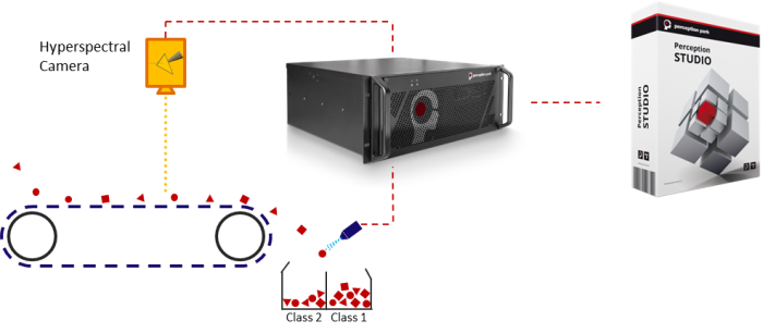 Based on the Perception Core Technology the Perception System is a complete stand-alone data processing solution. The Perception System can be seen as an adapter interfaced to a hyperspectral camera that standardizes cameras, suppresses disturbing influences and performs hyperspectral pre-processing as well as feature extraction and operation. The output is information extracted per object pixel (per spectra).